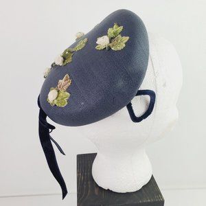 Other: This stunning hat is a tightly woven ratan/wicker hard material that has been heat treated with 3D velvet flowers buds and leaves. The back of the hat has a straight velvet bow that measures 3.75" wide with a 5" tail.