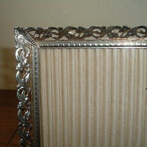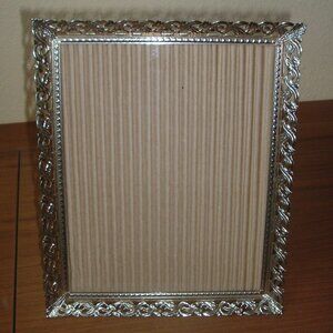 Nice quality 8 x 10 photo free-standing picture frame. Gold metal filigree with glass insert. The last 3 photos are just so you can see the outline of the beautiful filigree work. Holds an 8 X 10 photo. Outer measurements of frame: 11 1/4" x 9".