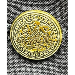 Buttons: Gold-tone embossed crest buttons with Latin script detail (both front and sleeves)