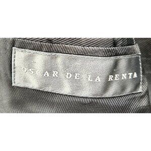 Features ornate gold-tone crest buttons with intricate Latin text — a sophisticated design hallmark of Oscar de la Renta tailoring. Timeless construction and luxurious feel indicative of high-end menswear craftsmanship.