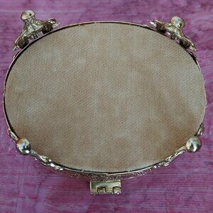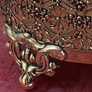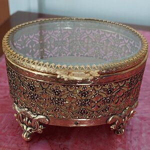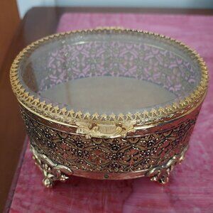 Vtg Oval Gold Tone Filigree Ormolu Footed Jewelry Box w/ Clear Glass Hinged Top