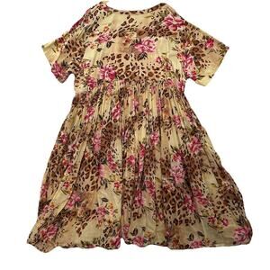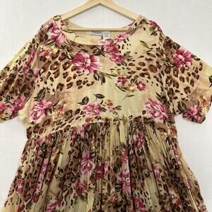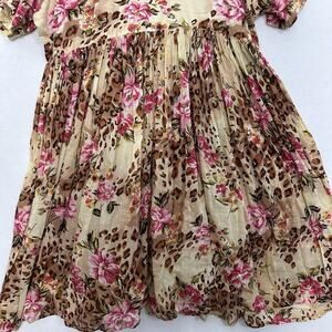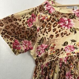 This vintage PHASES dress in size 2X features a vibrant animal print floral pattern, half sleeves, and a round neckline. Made from 100% cotton, this comfortable and lightweight dress has a full pleated skirt that adds a touch of boho and tropical flair. Perfect for travel, casual occasions, or lounging in style at home, this dress is versatile and easy to wear. With its slimming fit and flare style, it is a great choice for a laid-back yet chic look during the warmer seasons.