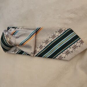 Stylish tie with gray, teal and orange stripes. Perfect for formal occasions.