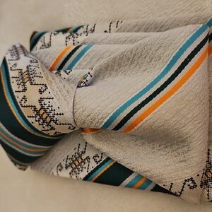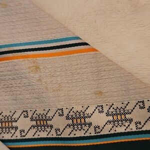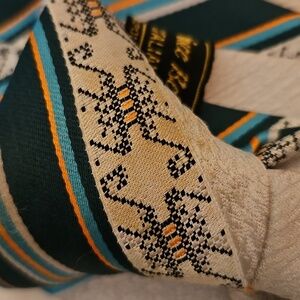 100% Polyester. There are a few stains, see photos. 3.5" wide