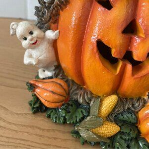 A charming Halloween decoration featuring a light-up pumpkin with a black cat and ghost. Creates a warm, festive glow for holiday ambiance.