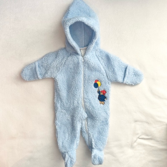 Vtg Paddington Baby Blue Fuzzy Sherpa Hooded Footie Outfit 0-6M bodysuit snow