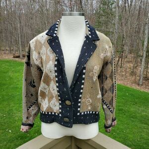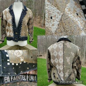 Vtg Painted Pony Women Tapestry Jacket Small Medium Black Tan White Flower Coat