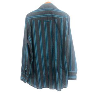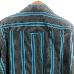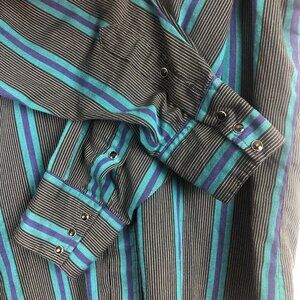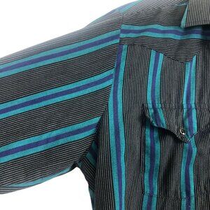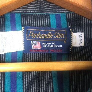 This vintage Panhandle Slim men's western shirt features classic pearl snap buttons, dual chest pockets, and a bold blue striped pattern. Made in the USA, this shirt is marked size 35 and offers timeless cowboy style with authentic Western flair. Great for rodeo wear, line dancing, or collectors of vintage Americana.