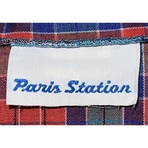 This vintage Paris Station short sleeve top shirt is a stylish addition to any woman's wardrobe. The red, blue, and teal plaid design adds a pop of color, while the classic collared neckline and button closure give it a timeless appeal. The pearlescent buttons and classic simple design make it a fashionable choice for women who appreciate retro style.