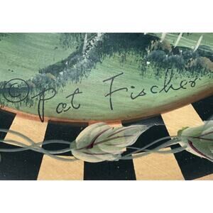 This vintage hand-painted plate by Pat Fischer features a lighthouse scene in a primitive folk art style. Signed by the maker, The Bayberry Company, this small ceramic and porcelain plate showcases a naive and original design from the 1990s. The multi-color painting adds a unique touch to this piece of antiques and primitives decor, making it a charming addition to any collection.