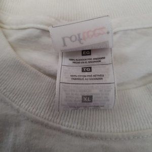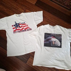 The second one has a flag and an eagle. And says, We will not doubt but affirm our faith in freedom, each other, and in the grace of God. Nothing is on the back. Size XL. Made by Fruit of the Loom. It does has a small spot, see picture, I did not try to get out.