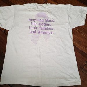 The first one has a flag on the front, Let Freedom Ring on the back is a purple ribbon, May God Bless the victims, their families and America. Made by Fruit of the Loom. Size XL.