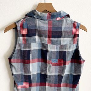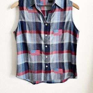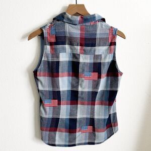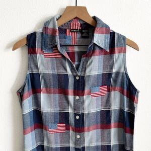 Vtg Patriotic Button Up Top Womens Medium Plaid American Flag Embroidered USA