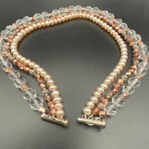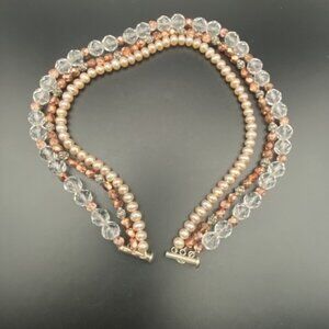 Vtg Peach Necklace 3 Strand Sterling Silver Acrylic Bead Iridescent Crystals