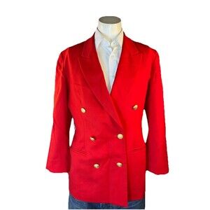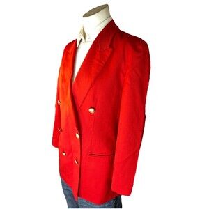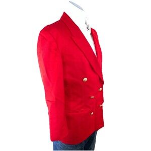 This vintage Pendleton blazer is a classic women's jacket made from 100% Virgin Wool in a solid red color. With a mid-length style and double-breasted button closure, this blazer is perfect for formal, workwear, and business occasions. The blazer features lined interior, shoulder pads, and pockets, making it suitable for all seasons. Made in the United States, this blazer carries accents of the Christmas season, USA holidays, and a preppy style. With its timeless design and high-quality material, this blazer is a versatile and stylish addition to any woman's wardrobe.