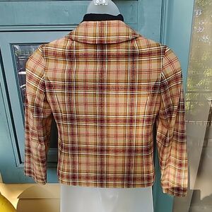 This tony Tan plaid Pendleton jacket would look quite posh with some jodhpurs and riding boots. It has a Peter Pan collar and front patch pockets. The exterior is in very good vintage condition with no rips, stains or picks. Inside satin lining has some tears (and some nice functional armpit protectors!). Vintage size 10.