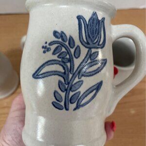 Classic stoneware mugs with a timeless blue floral design, offering charm and durability for daily use or display. Sturdy build and vintage appeal.