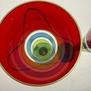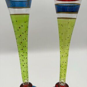 This striking set of two vintage Pier 1 vases showcases handpainted art blown glass champagne flutes with a vibrant red, blue, green, and gold design. Ideal for adding a splash of color and elegance to any room, these vases are crafted with care and attention to detail, making them a unique decorative piece.