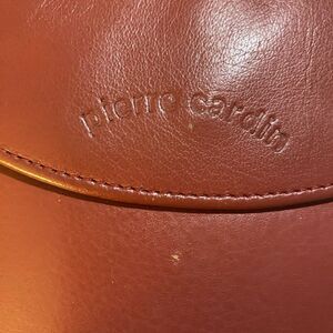 This vintage Pierre Cardin leather crossbody handbag features a rectangular shape with two zippers and a snap closure.