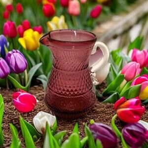 This is a vintage hand-blown Cranberry glass creamer/pitcher by Pilgram Glass of West Virginia. It is in the Bennington pattern, one of the company's specialty patterns in the late 1970s.