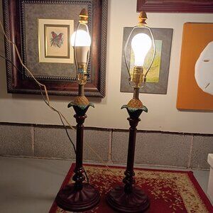 These are in good pre-owned condition. One has a gold cord - the other has a black cord, but both seem to be original to the lamps. Tested and works. No shades or bulbs included.