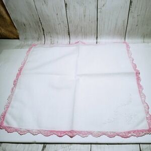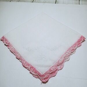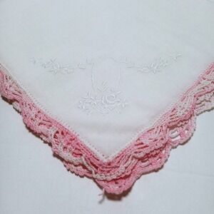 Vtg Pink Crochet Edge Handkerchief White Embroidered Flower Basket Cottagecore