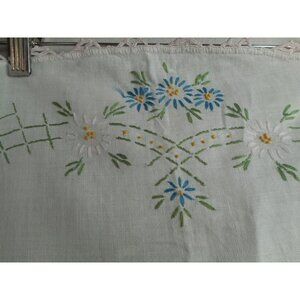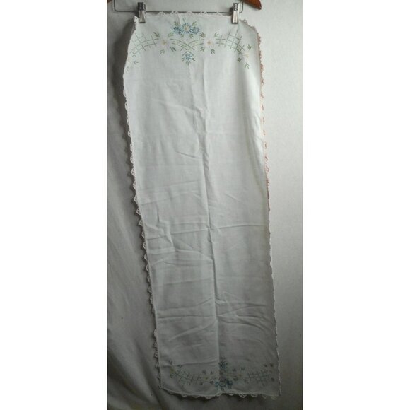 Vtg Pink Lace Blue and Pink Floral handmade embroidered Dresser scarf runner