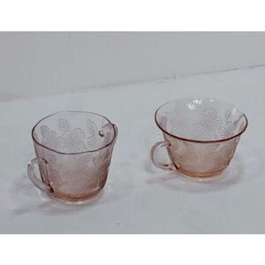 Vintage Pink Depression Glass MacBeth Evans DOGWOOD Pattern Creamer & Sugar. Beautiful pale pink depression glass from Macbeth Evans Glass Company. Cream and sugar set. No lid. This pattern was made in the 1930’s and is now discontinued. The condition is amazing for 90 year old glass. No chips or cracks.