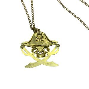 This intricately designed pirate skull pendant necklace brings a bold statement to any outfit. Featuring a vibrant red enamel hat and sparkling rhinestones, it stands as a symbol of adventure and style. The gold-tone finish adds a touch of luxury, making it a unique accessory for those who appreciate distinctive jewelry.
