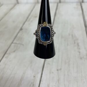 The ring has possibly been worn before. They are two tone, silver and gold. With a blue center stone.