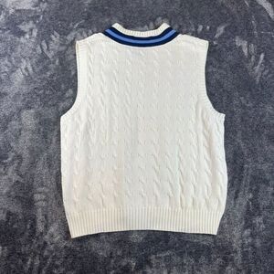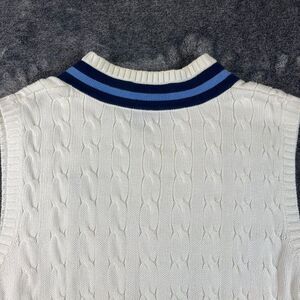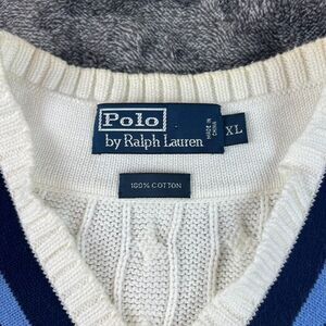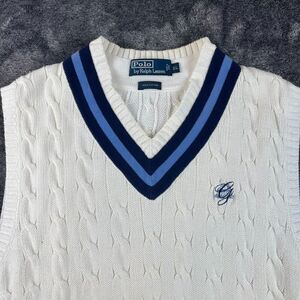 Vtg Polo Ralph Lauren Cricket Cable Knit Sweater Vest Tennis Logo Sleeveless XL. **Has logo on front of vest; minor yellowing on collar and front of sweater as shown in photos. Also, minor spot on left front side of sweater. No other flaws noted. Refer to all photos for condition and sizing.