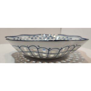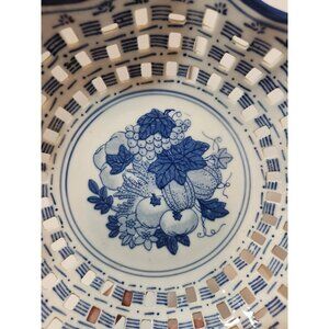 Vtg Porcelain Basketweave Reticulated Blue and White Fruit Bowl Made in China