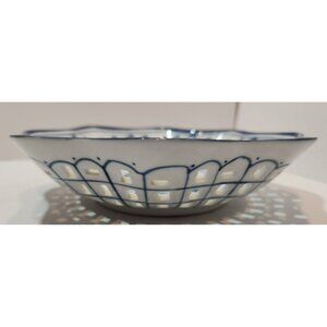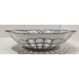 Crafted with a classic appeal, this vintage porcelain bowl features a timeless blue and white design. Its reticulated pattern and basketweave detail add a touch of elegance, making it a versatile piece for any table setting. Originating from China, the bowl embodies the traditional artistry of blue and white pottery, which has been admired for centuries. The piece is unmarked, reflecting a simple and unadorned aesthetic that showcases its beauty. It is a perfect addition to any collection that appreciates the understated charm of vintage decor. Whether used for special occasions or displayed as a decorative item, this bowl brings a whisper of nostalgia and sophistication to your home. Pre-owned by collector. In good condition. Please see pictures for details.