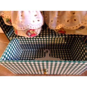 The doll is in EXCELLENT condition and is still secured in the box with the original inlaid green ribbon. The clothing shows no visible flaws.