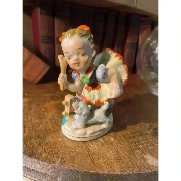 Vtg Porcelain Figurine - Made In Japan - Girl playing With Dog & Stick.