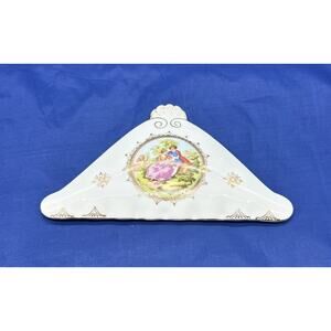 Vintage Porcelain Triangle Trinket Jewelry Dish with Lid Courting Couple Gold Accent.