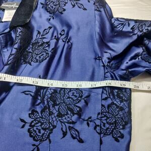 Vintage Positive Attitude blazer dress, navy blue satin with black velvet burnout floral pattern. Women's size 10.