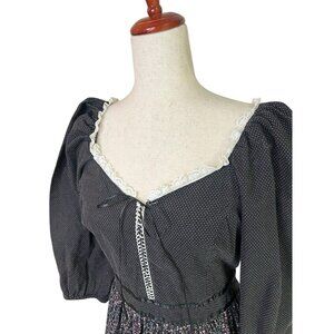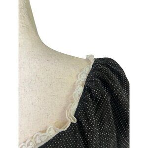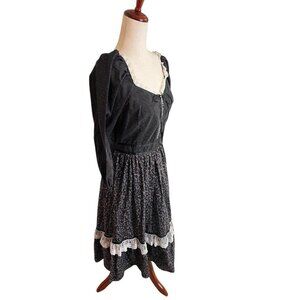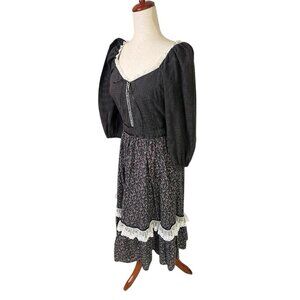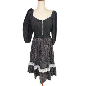 Vtg Prairie Dress Small Cottagecore Midi Black Ditsy Floral Lace Gunne Ruffle