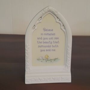 Vintage Precious Moments Porcelain Bisque Tabletop Cathedral Window Shaped Plaque "I Believe In Miracles" (1999)