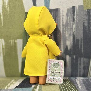 This officially-licensed Precious Moments™ vinyl doll is designed by artist, Linda Rick. The doll wears a yellow hooded raincoat with an orange beak on the hood. She wears orange boots and her beautiful blonde braids are tied with yellow ribbons. She has the classic Precious Moments sweet expression with deep brown, teardrop-shaped eyes.