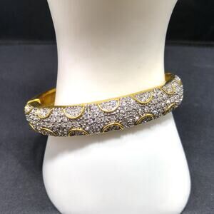 *Description: This is a beautiful Premier Designs rhinestone hinged bracelet with a magnetic clasp from the 1980s. The bracelet is gold plated with clear rhinestones pave' set through the front of the bracelet. NOTE: There is one tiny rhinestone missing which I saw under the loop magnification after photographing. Please note detail in photo. The bracelet is beautiful and full of sparkle. This would be a great addition to your vintage jewelry collection or make a great vintage gift!