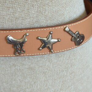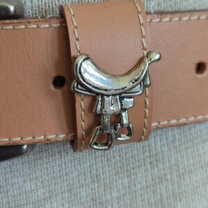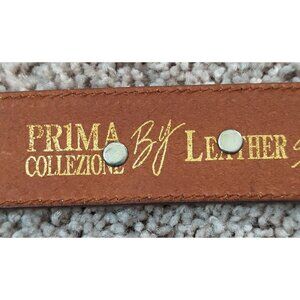 This vintage Prima Collezione by Leather Shop Western belt features a solid brown leather construction with a medium width and a stylish buckle accent. The belt is designed with a Western theme in mind, making it a unique and classic accessory for women with Western theme charms. Please note there is one charm missing (see picture). Made with high-quality leather and adjustable hardware, this belt is both functional and fashionable, adding a touch of flair to any outfit.