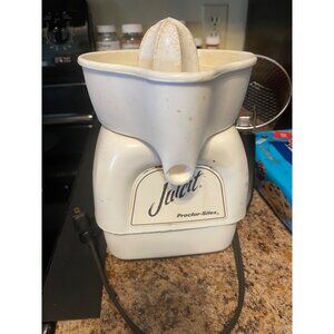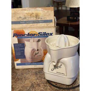 Vintage Proctor Silex Juicit automatic juicer in white, complete with a ceramic reamer. Ideal for juicing all types of citrus fruits. The model number is J1170. Original box which has damage. The juicer is in very good working order. There is minimal rust.
