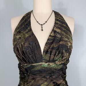 Vtg Prom Dress Maxi Gown 8 Brown Green Silk Y2K Fairy Grunge Bead Nymph Halter