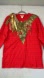 * Red cotton blend, long line, shoulder pads, gold accent stitching, hand wash only