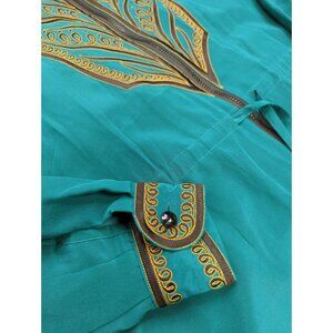 This vintage Bob Mackie Wearable Art jacket is crafted from 100% silk, offering a luxurious texture and feel. The intricately embroidered design accentuates the vibrant teal hue, while the zip closure and drawstring waist provide a tailored fit. Made in China, this jacket represents elegance and quality. New Old Stock