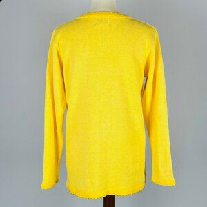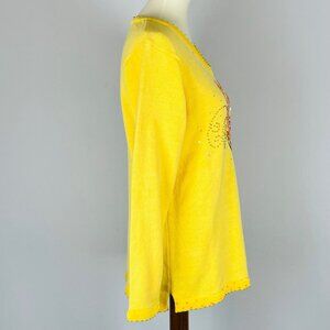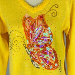 Vintage Quacker Factory v-neck sweater in size small. Vivid lemon yellow with velour trimmed collar & cuffs, featuring an iridescent sequined butterfly accented with gold jewels and beading. Made in China of 55% ramie 45% cotton. Measures 21" armpit to armpit, 25.5" neck to tail, 22.5" sleeve. Superior condition with no holes, tears, stains, or ripped seams. Smoke free, pet friendly home.