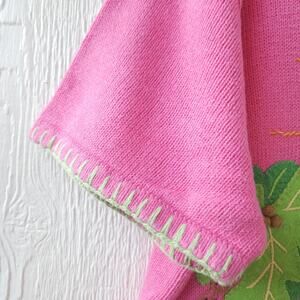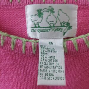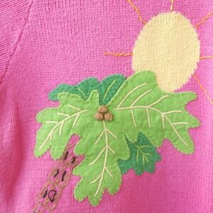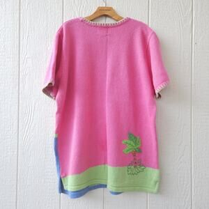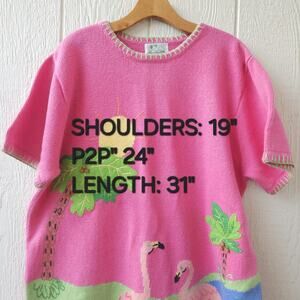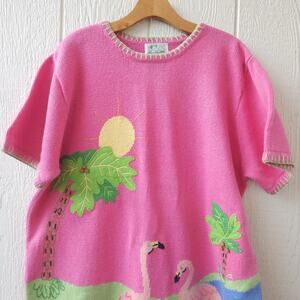 Bring some fun, tropical vibes to your wardrobe with this vintage Quacker Factory flamingo sweater. Made in Hong Kong, this bold pink knit short-sleeve sweater (XL) features a colorful applique & beaded tropical scene with flamingos, palm trees, sunshine, and water. Perfect for summer, vacation wear, or collectors of quirky 80s, 90s sweaters.