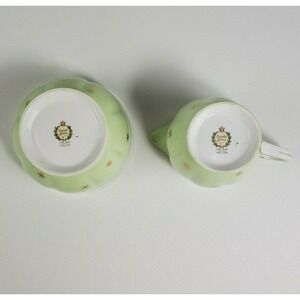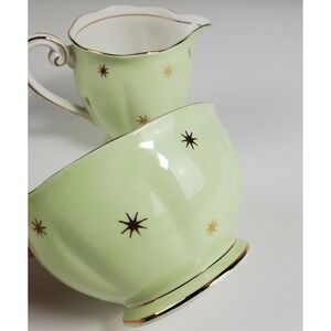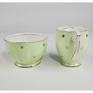 * Condition: Very good pre-owned condition. Lovely vintage mint green set with footed creamer, sugar bowl and gold stars.