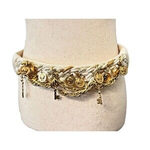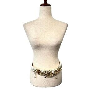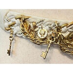 Vtg REBECCA'S Braided Statement BELT Gold Coins Keys Chains White Nylon Gypsy